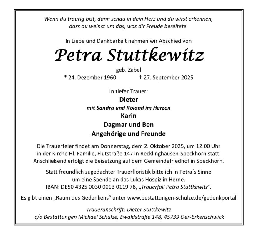 Ich wünsche Ihnen von Herzen viel Kraft, Trost und Menschen an Ihrer Seite, die Ihnen beistehen.